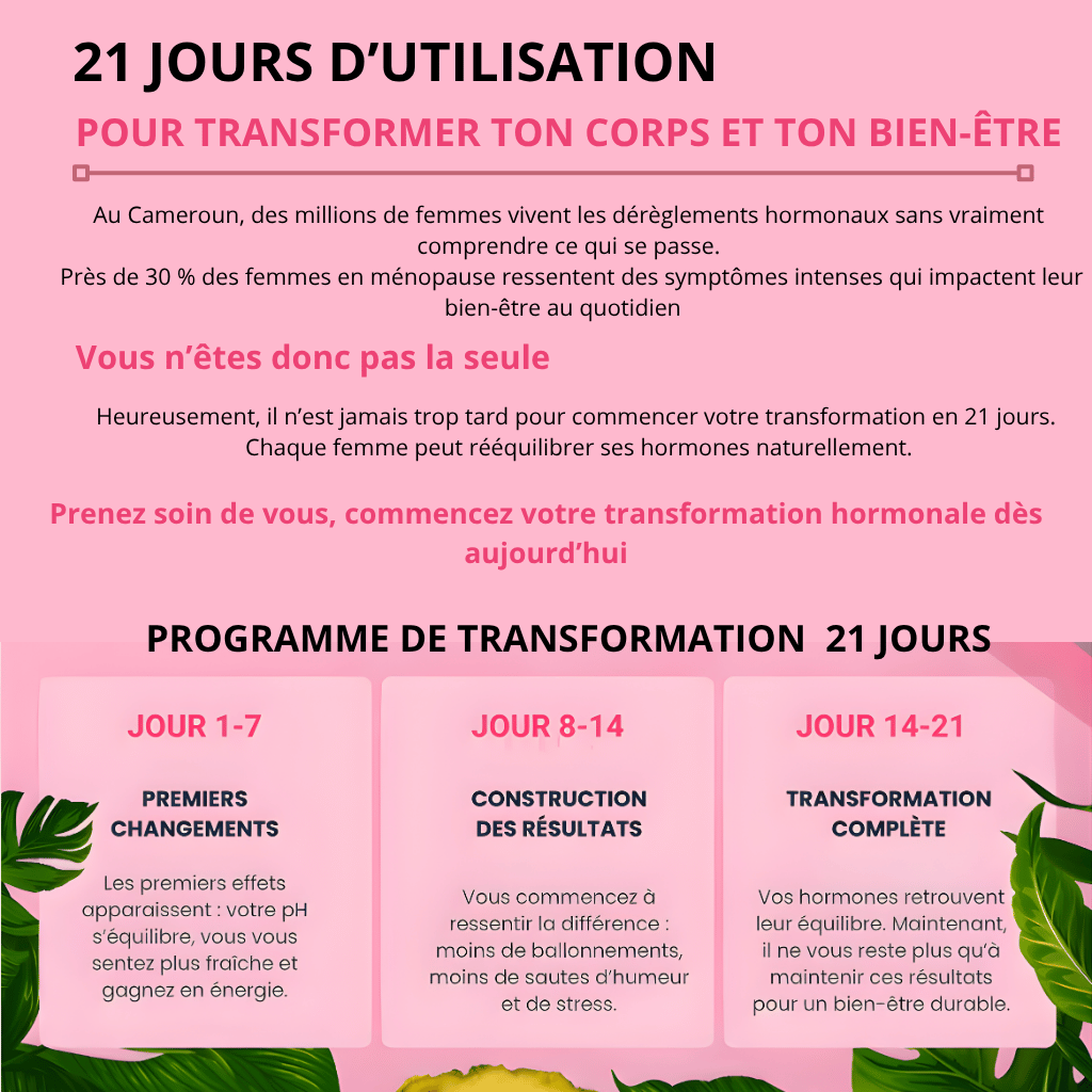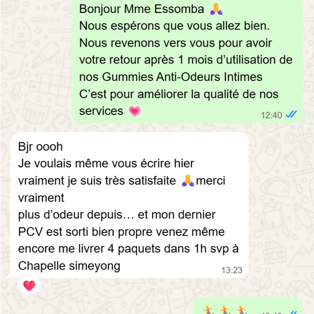 Si après 30 jours d'utilisation vous ne constatez aucune amélioration sur les odeurs ou l’inconfort intime, écrivez-nous simplement sur WhatsApp et nous vous remboursons